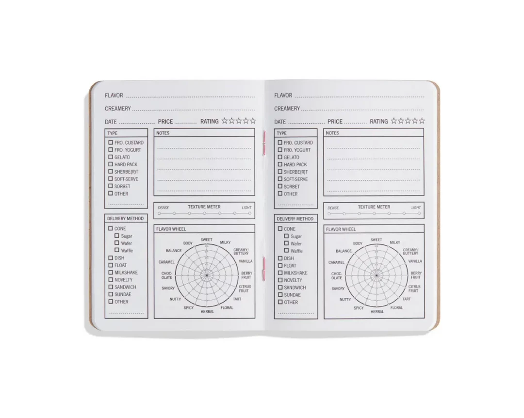 33 Scoops is a pocket ice cream tasting journal that provides a fun way to record your dairy discoveries in a delightfully diminutive notebook format. Take your tasting notes, using the checkboxes to note delivery method (cone, dish, float, milkshake, sandwich, etc.). Use the texture meter to memorialize the cream’s consistency from dense to light. Dimensions: 3.5″ x 5″.