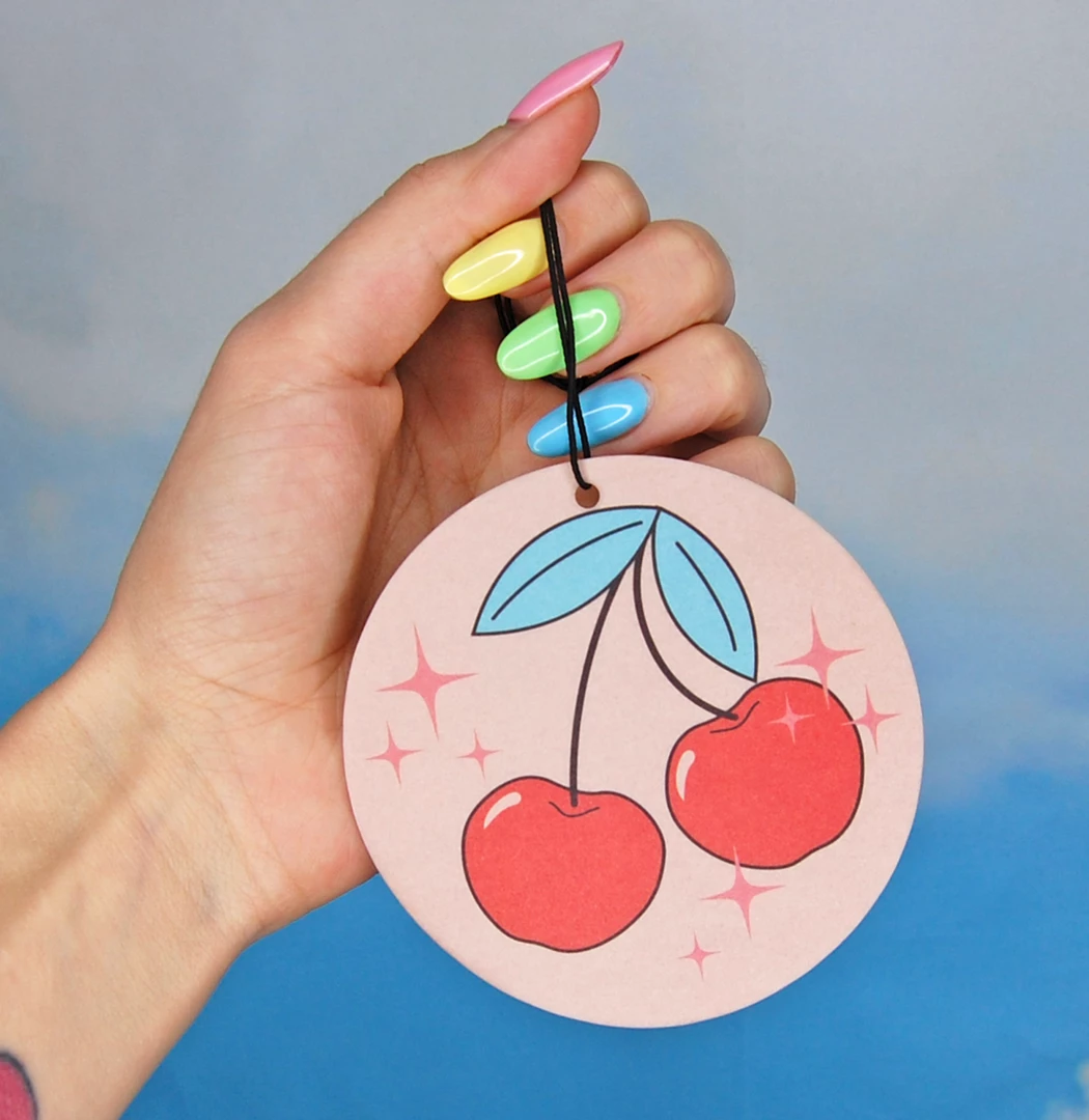 Make your car a little bit kitschier with this air freshener. Air freshener is cherry scented and comes with an elastic cord to loop around a rear view mirror. This scent was very polarizing at the ASOT HQ- some love and some hate! Smells just like the glossier balm in cherry so if you love cherry this is the one for you! Air freshener measures 3.5″ x 3.5″ and is double sided