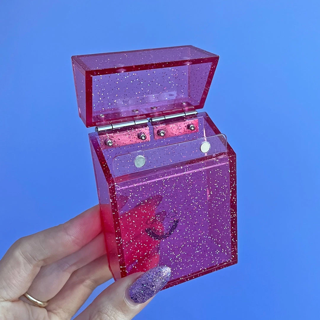 Pink glitter acrylic cigarette box perfectly fits your average sized carton of cigarettes or any tobacco you roll yourself + a lighter. Also perfect for cash, cards, lip gloss, whatever else fits will look infinitely cuter!