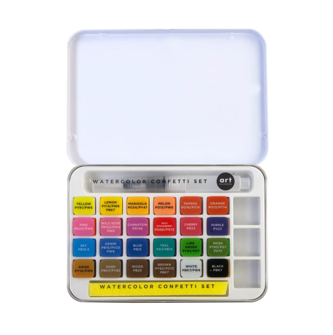 Watercolor Confetti Set: An introductory set perfect for travel, sketching, basic water coloring and more. This set provides all the basic watercolors you need in one set, offering quality and brilliance you love from Art Philosophy. Included is a sturdy metal tin and mixing foldout well for easy color mixing.