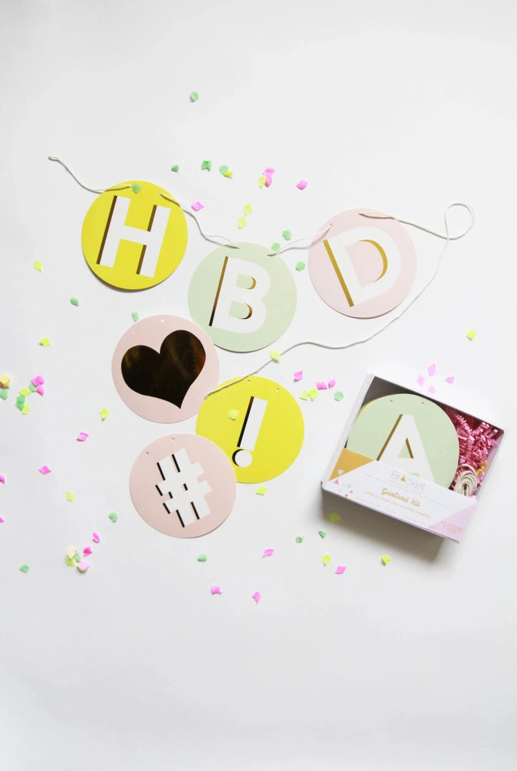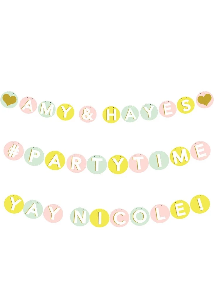 Create your own party banner and decorations with our garland kit. We’ve designed this kit in a modern color combo with beautiful gold foil accents on each letter. It comes with 80 alphabet and symbol tiles in 3 modern colors with gold foil accents. 5 yards of string included.