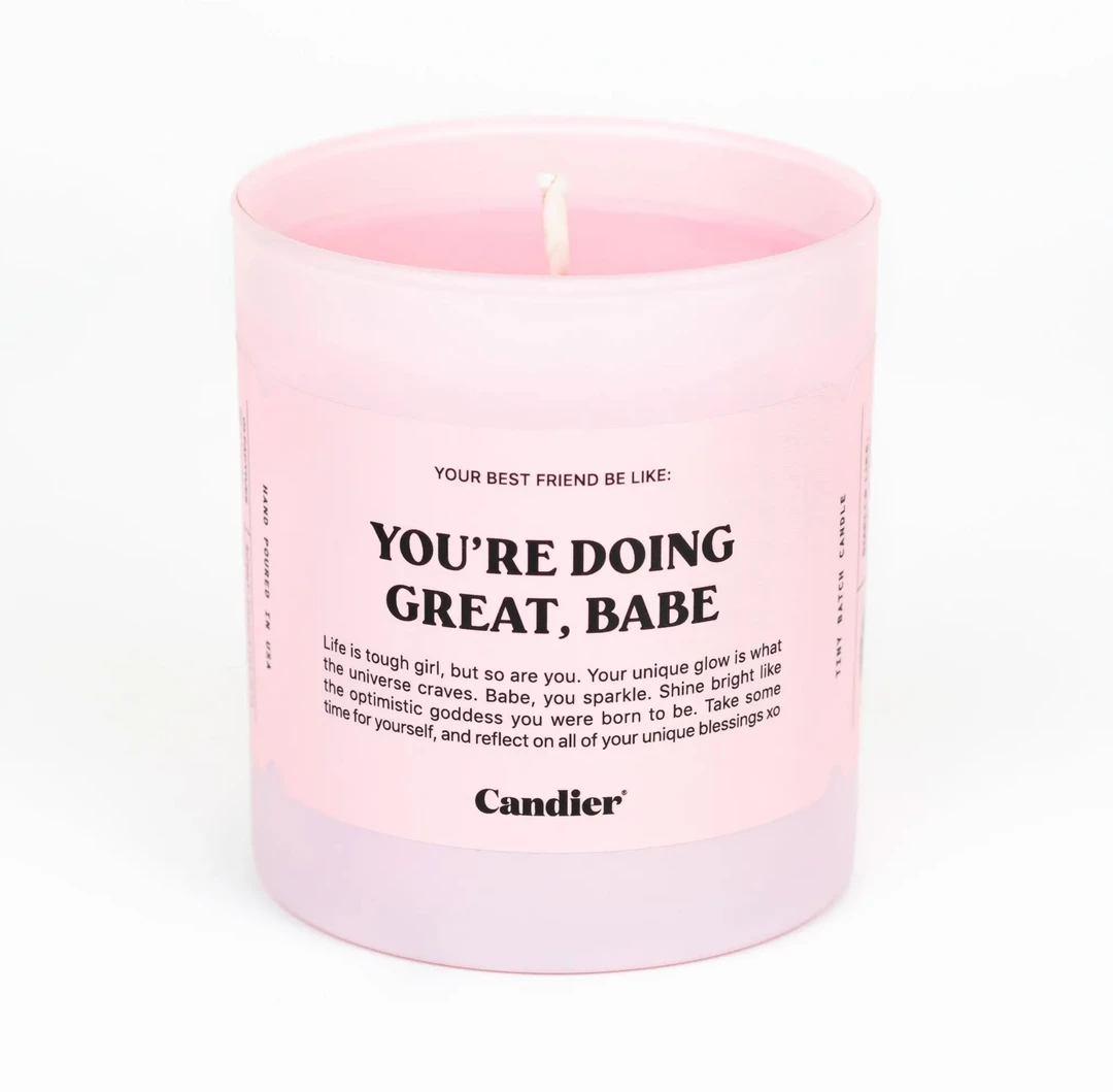 Your Best Friend Be Like: “YOU’RE DOING GREAT, BABE” Life is tough girl, but so are you. You deserve to take some time to unwind with this blend of lavender, sage, chamomile, cedar and sandalwood. This cute candle is 100% soy wax, fragranced with essential oils. It’s phthalate free. It’s crafted and hand poured in the USA. Keep going baby girl xoxo.