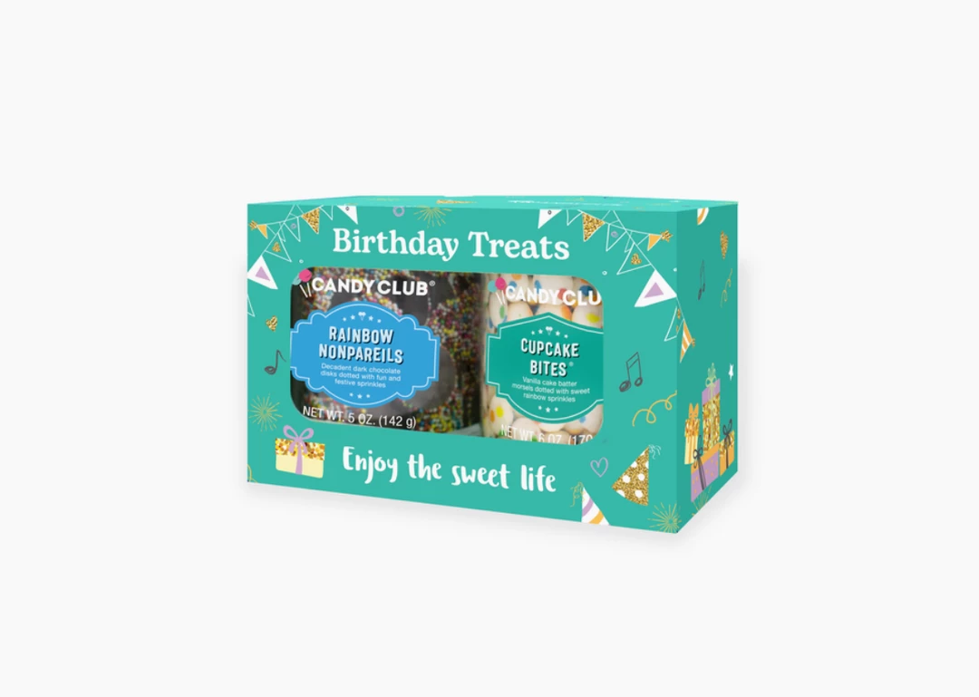 Send a BIG birthday greeting to someone special with a sweet assortment of delicious gourmet delicacies. The Sweet Birthday Gift Box is brimming with colorful sprinkled chocolates, and delightful cupcake bite treats. The bright and colorful message says it all: Happy Birthday! Birthday Candy Gift Set includes one small cup of Rainbow Nonpareils and Cupcake Bites