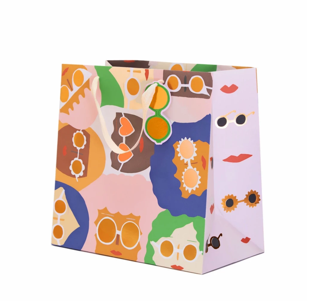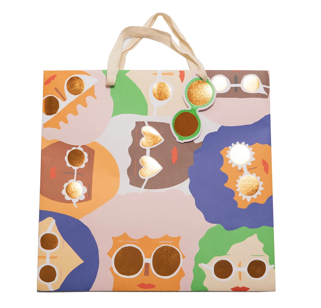 13″ x 12.5″ x 7″ Sturdy paper gift bag with gold foil details, shaped tag, and flat-woven cotton handles. Printed in China.