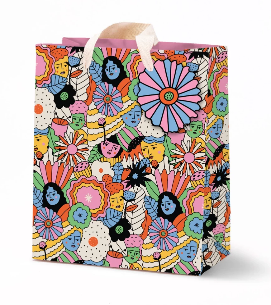 9.5″ x 8″ x 4″ Sturdy paper gift bag with gold foil details and flat-woven cotton handles