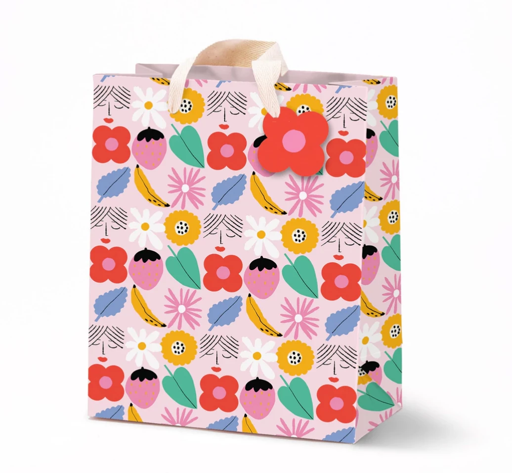 9.5″ x 8″ x 4″ Sturdy paper gift bag with gold foil details and flat-woven cotton handles