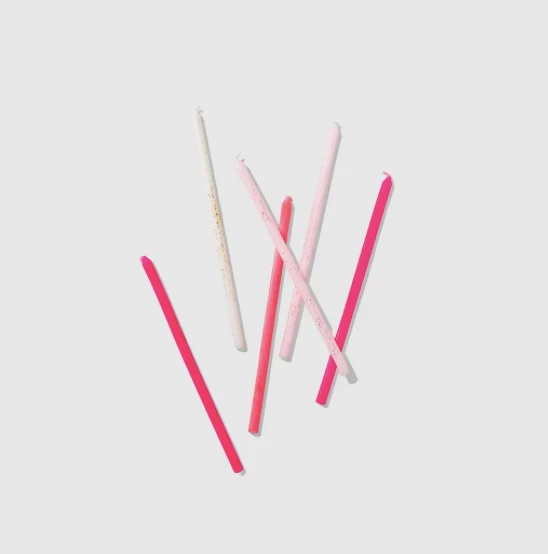 No one wants to blow out boring candles. The varying shades of pink on these fun candles get an added pop with glitter. Includes 12 candles.