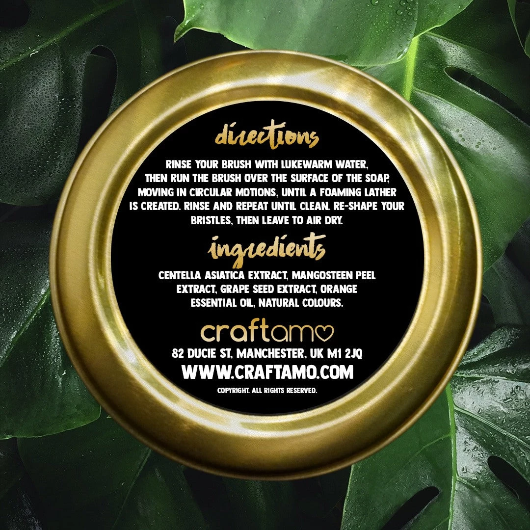Craftamo brush soap targets paint pigment, to extend your brush life. Our natural ingredients naturally soften your bristles, so they absorb paint pigments easier. Our soap naturally removes paint residue, so your bristles keep their shape for longer. Simply an essential purchase to care of your most precious brushes.