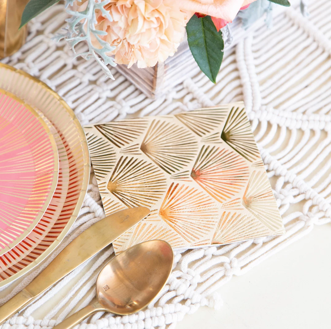 Our La Boheme collection is the perfect party tableware for a dinner party, summer birthday, picnic, tropics party! Pair with the rest of our La Boheme tableware to complete the look. Paper Cocktail Napkins Pack of 20 Approx: 5″ Gold foil details Not safe for microwave use