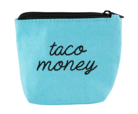 For all that taco money. Black thread embroidered onto aqua canvas coin purse.