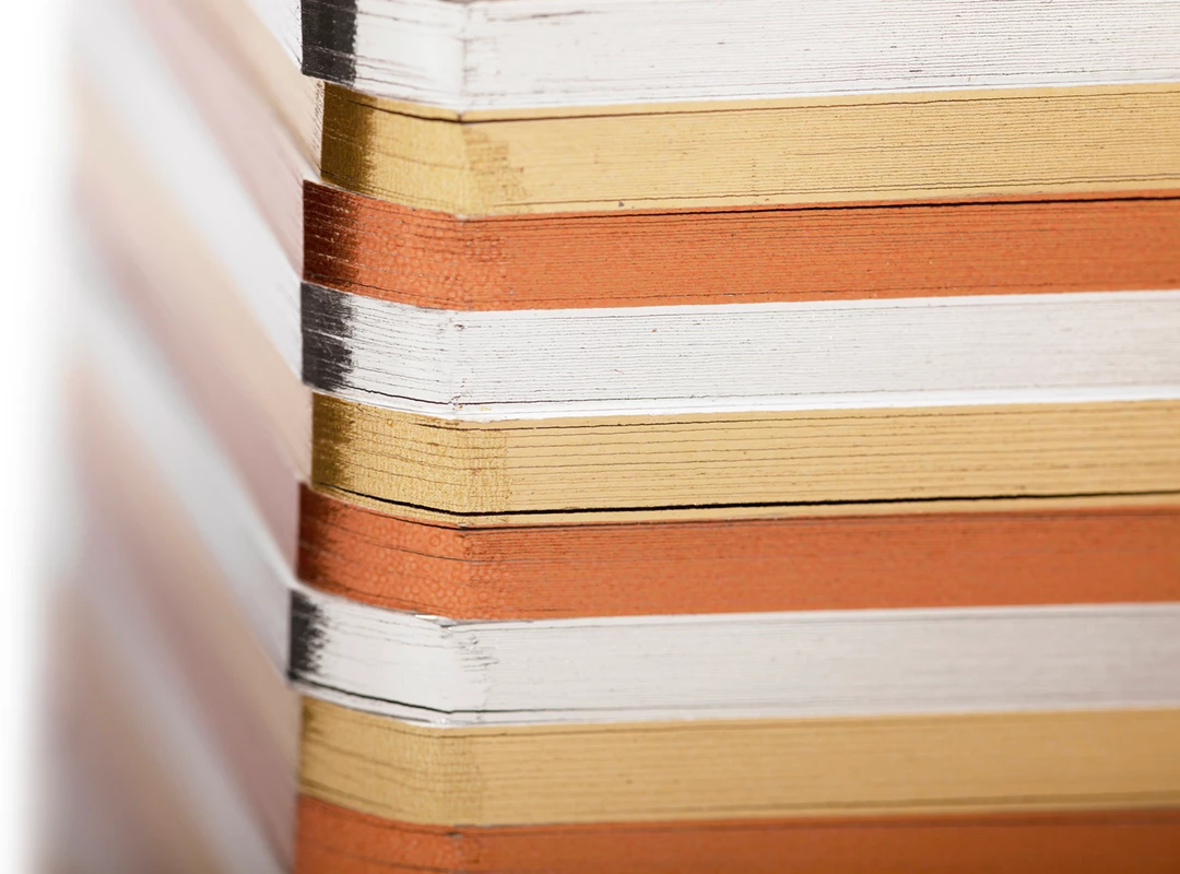 Corners rounded to 3/8″ (9.5mm) and gilded by an Ochsner round corner gilder.