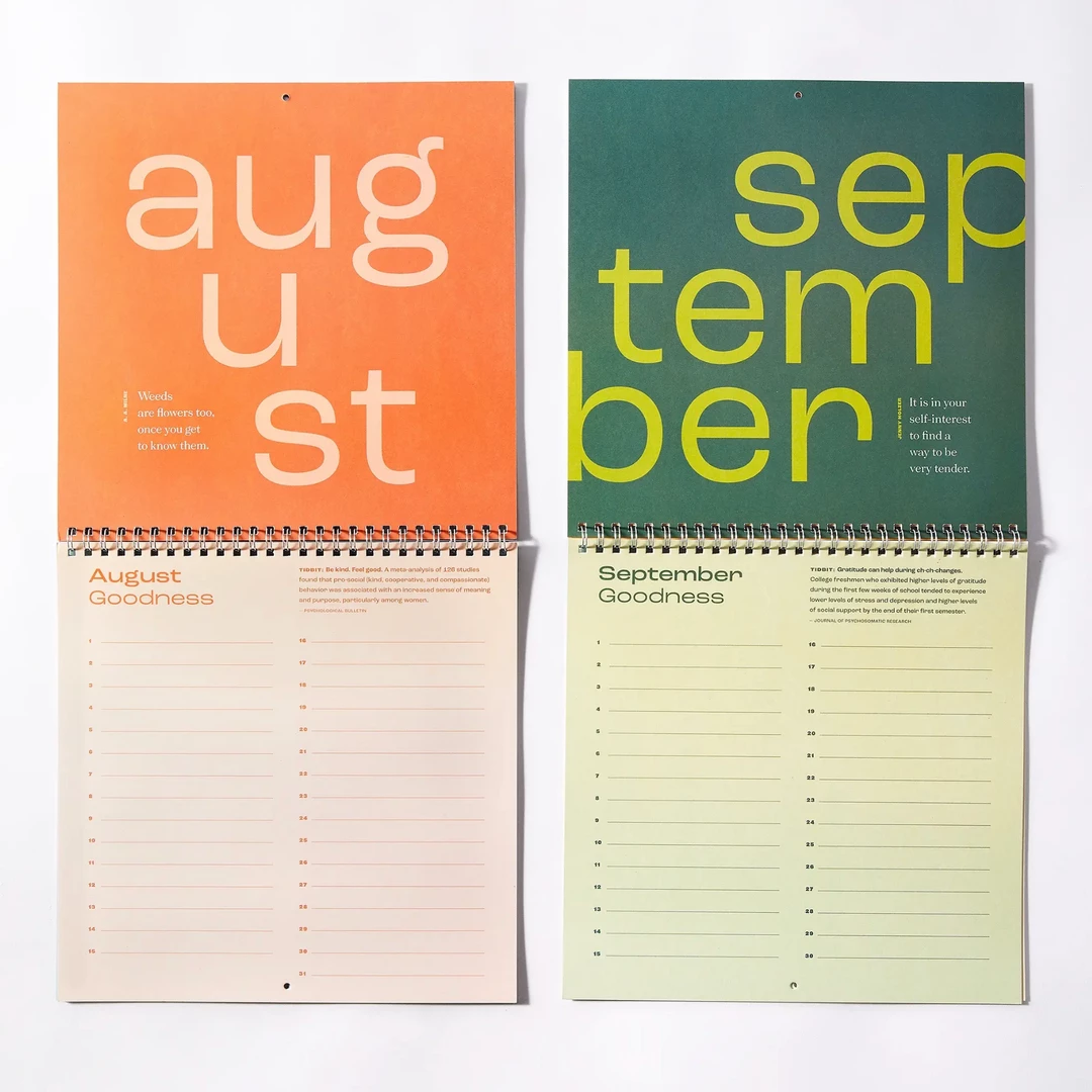 The Calendar of Good is a beautifully designed 12-month calendar to help you remember the good things, big and small, that happen all around us every day.