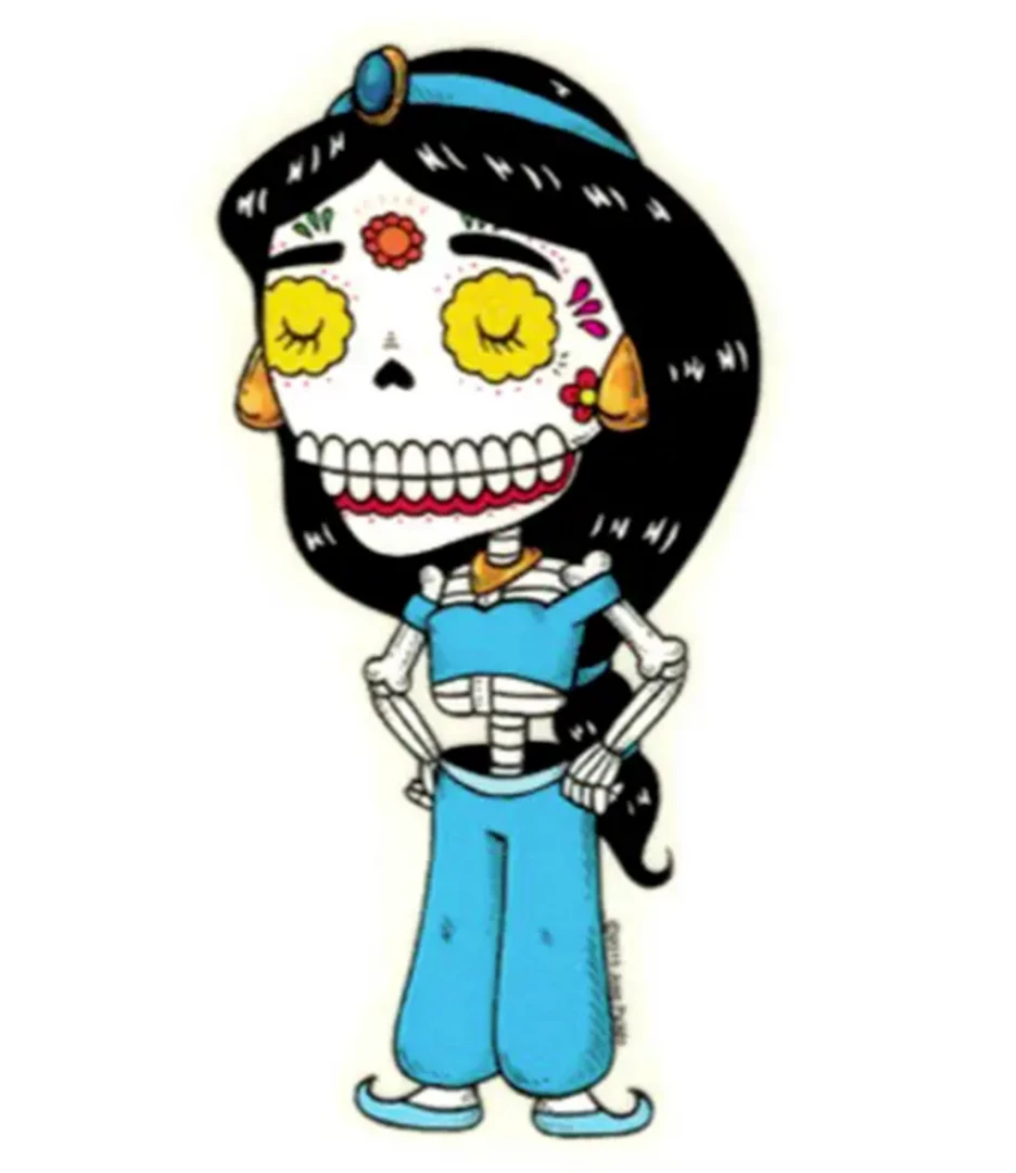Take a magic carpet ride with this Princess Jasmine inspired Day of the Dead Character Sticker. Mis nopales artwork, high quality weather-proof vinyl sticker, screen printed professionally, the stickers are die-cut and most measure approximately 2.5 x 4, great for windows, laptops, skateboards, cars, guitars, folders, and just about anywhere you can think of! Length: 4. Width: 2.5. Height: 0.031. Weight: 0.035273962 oz.