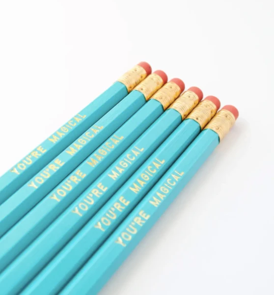 Each set contains 6 No. 2 hexagon pencils with gold ferrules and red erasers.
