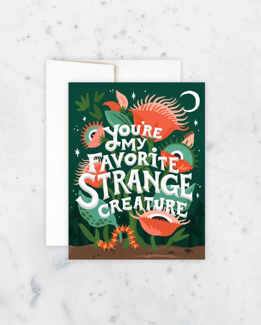 Fantastical, carnivorous plants adorn a starlit scene with pillow-embossed lettering. The perfect unique greeting for your favorite creature! • HEAVY, MATTE EGGSHELL STOCK • BLANK INSIDE • 4 1/4″ X 5 3/4″ • PAIRED WITH MATCHING ENVELOPE