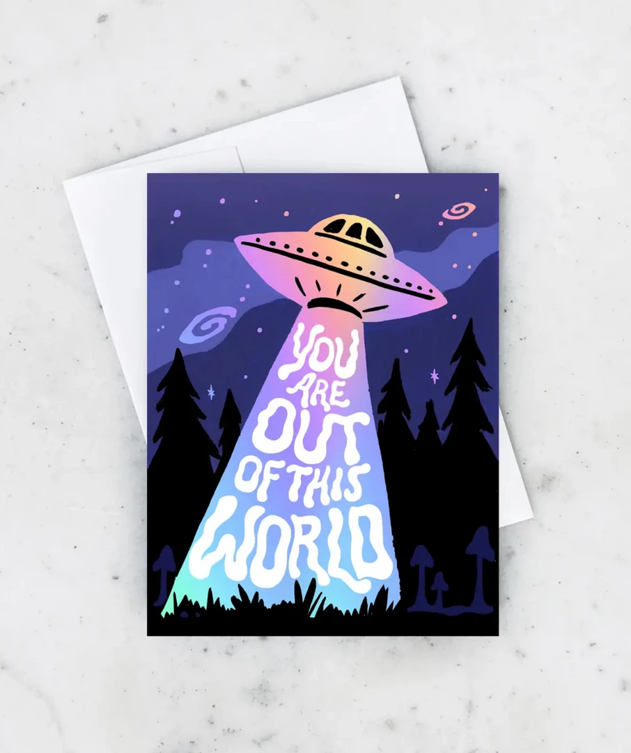 Holographic foil illuminates this funky, out of this world greeting! • HEAVY, MATTE EGGSHELL STOCK • BLANK INSIDE • 4 1/4″ X 5 3/4″ • PAIRED WITH MATCHING ENVELOPE