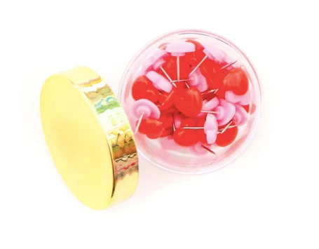 Make your workspace the cutest ever with these pink and red thumbtacks in a cute gold lid container. Each set comes with 50 thumbtacks.