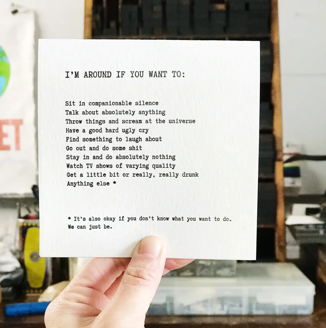 Grieving is hard and often isolating. Send a sympathy card to let them know that you’re around, no matter what. PRODUCT SPECS // 4.75″ x 4.75″ (folded) / Blank inside / Letterpress printed / Paired with a recycled kraft envelope