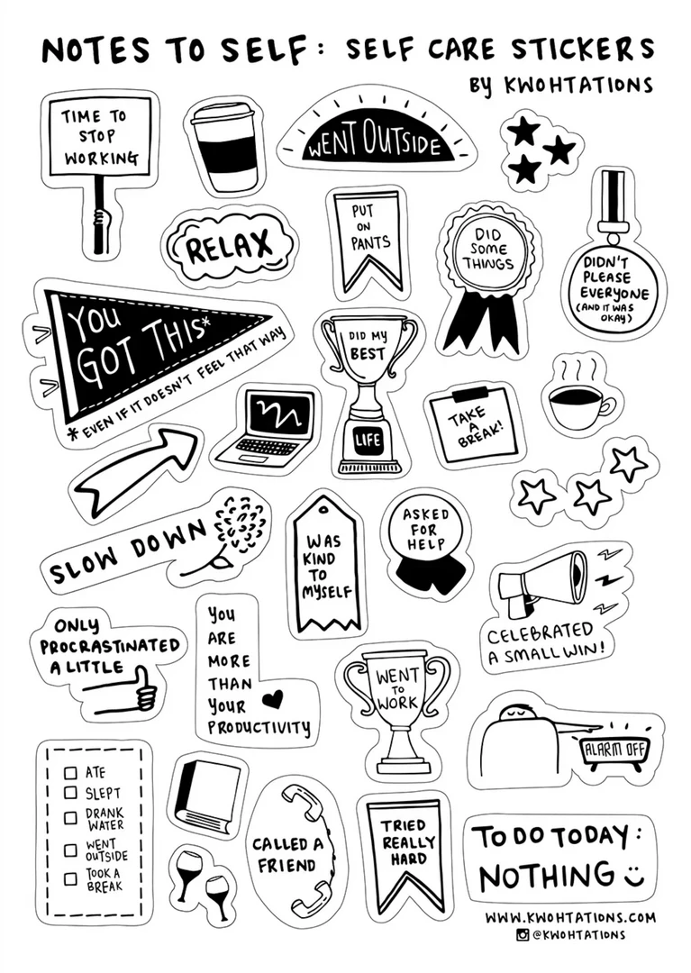 Self-care sticker sheet for your planner, cell phone, laptop, or anywhere else for a little reminder that you’re doing okay – and that it never hurts to show yourself a little extra care and affection
