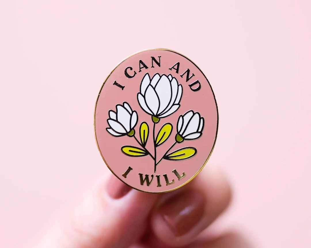 I Can & I Will enamel pin. 1.25″ wide x .5″ tall hard enamel pin. 2 pin posts / 2 black soft rubber clutches. Packaged on paper backing cards, in cello sleeves. Smooth polished surface & rubber clutches for comfort.