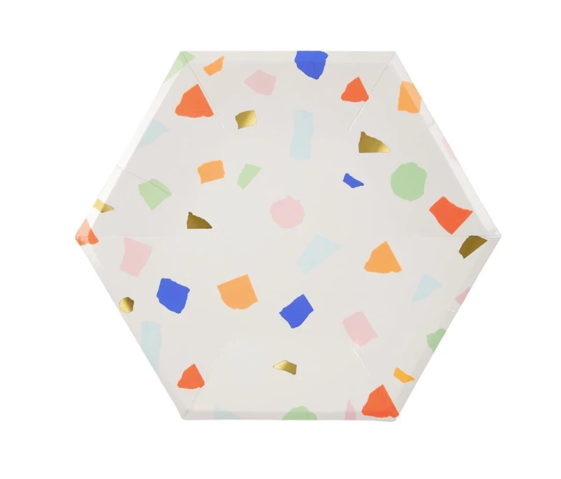 Be it a children’s party or a graduation celebration, a picnic, a barbecue or an engagement party, you should add a little color to your occasion with our Bright Terrazzo collection. This range of high-quality tableware features a striking pattern of multicolored neon confetti with gold foil details. Plan your whole decor around this bold palette, or mix and match with other colors, patterns, and themes.