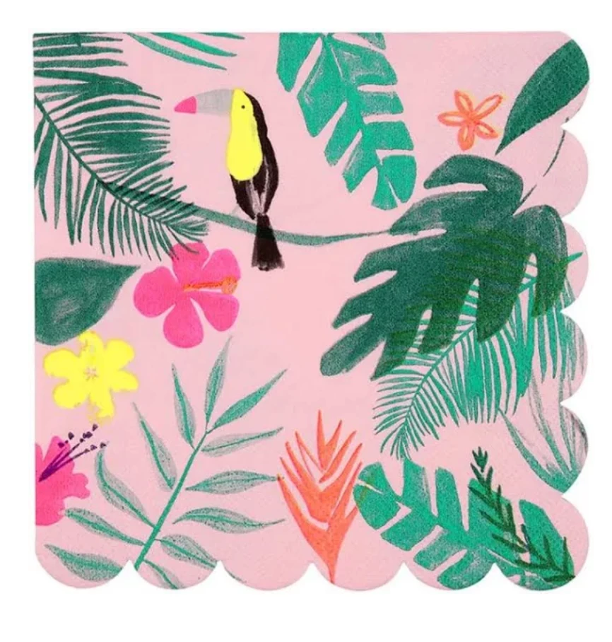 Add a splash of color and a healthy dose of a sunny climate to your summer party with our bright and beautiful Tropical party collection! These stylish party napkins are decorated with a bold jungle pattern of leaves, flowers and a delightful toucan – perfect for a touch of exotic beauty!. Scalloped edges add a fun touch.