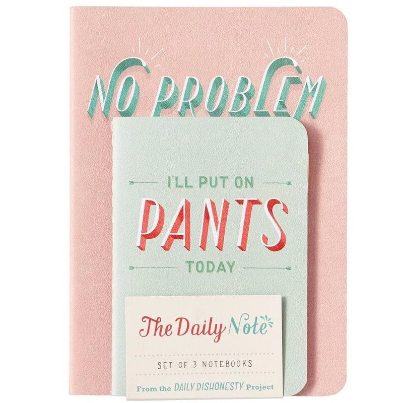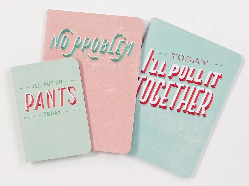 Set of 3 notebooks with sturdy covers & sewn binding. 2 large (“No Problem” and “Today, I’ll Pull It Together”) and 1 small (perfect for covid times: “I’ll Put on Pants Today”). Inspirational; you decide whether the quotes – and your notes – are honest or not.