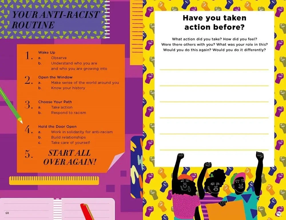 With prompts like “What is your anti-racist vision?” the workbook invites you to reflect in an open-ended way on how you see your role in the fight against racism, yet the workbook also prompts the reader to reflect on how they plan to care for themselves while they engage in activism that can be emotionally draining.