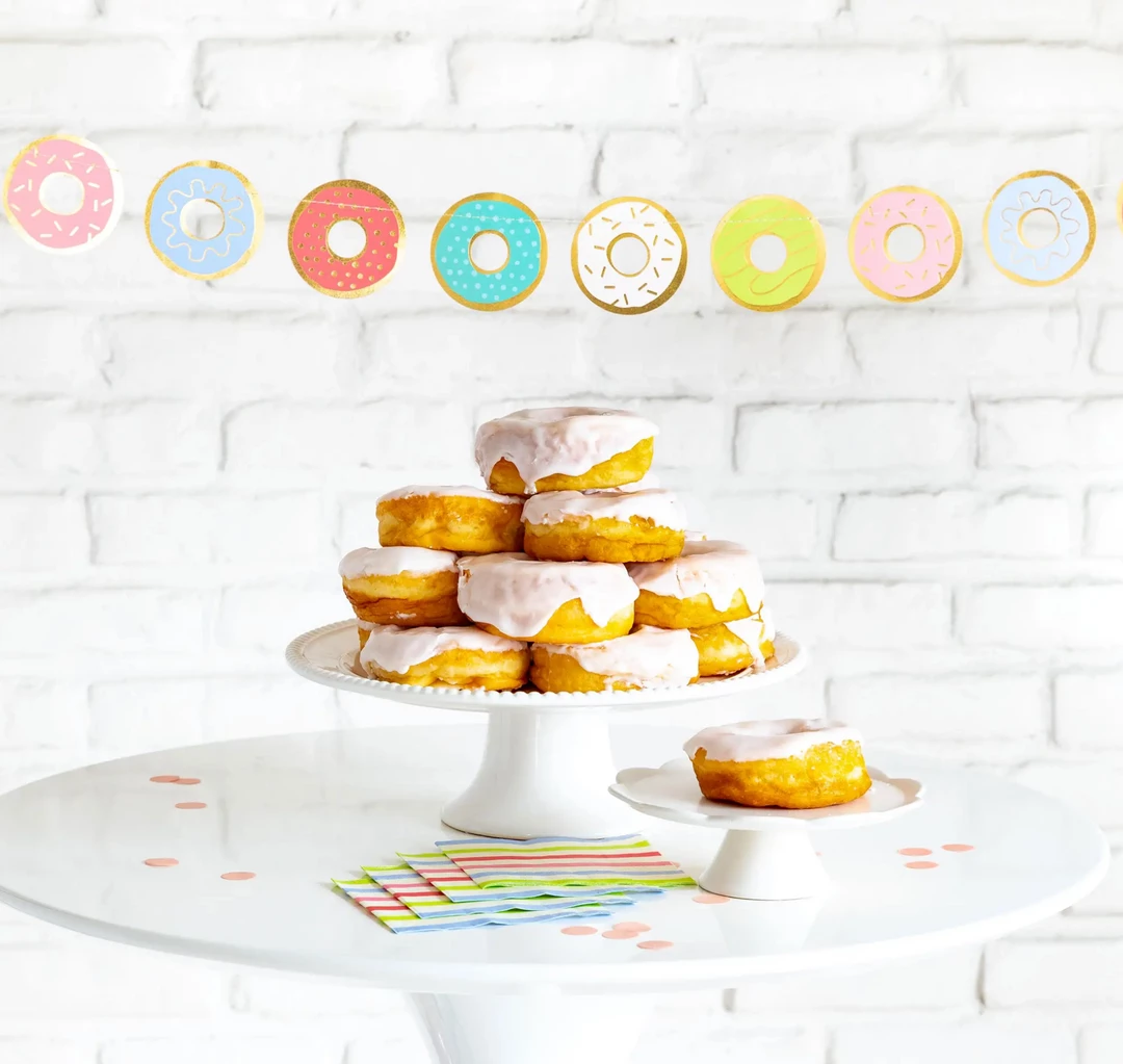 Do you love donuts? Then celebrate that love by hanging this cute donut banner to show it. Perfect for a donut themed birthday party or bakery display. Celebrate the baker’s dozen you picked up for the Monday meeting. However you choose to celebrate with donuts, this colorful banner makes a delicious display! • Banner is approximately 5.5′ long • 18 – 3″ x 3″ donut banner pieces • 6 designs, 3 of each design • Pre-stitched • Double-sided • Gold Foil
