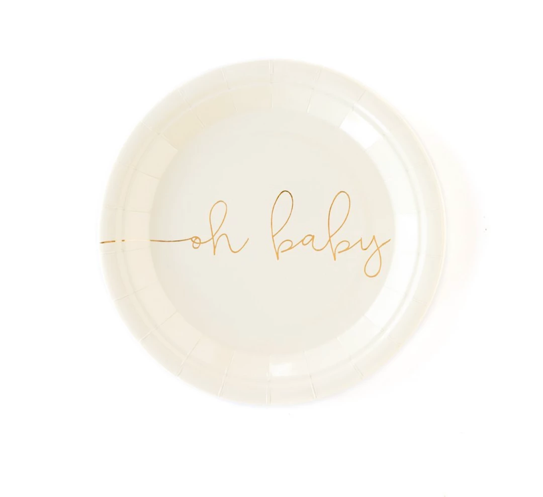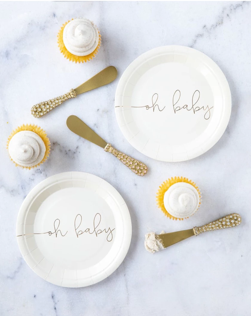 Are you planning a soiree to welcome baby? These 7″ round paper plates have got you covered. Don’t worry these cute cream and gold party plates won’t reveal the surprise too soon.