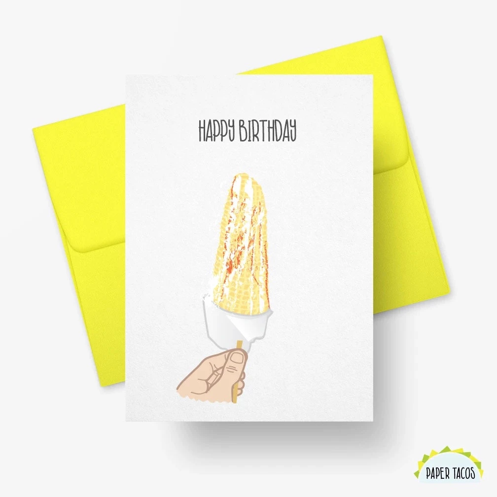 A corn on the cob is not complete, unless es un elote preparado. Put on some mayonnaise, cheese, chilli powder and don’t forget the lemon and salt to make this elote ready to eat. Wish your family and friends a happy birthday with this mouth-watering elote card.