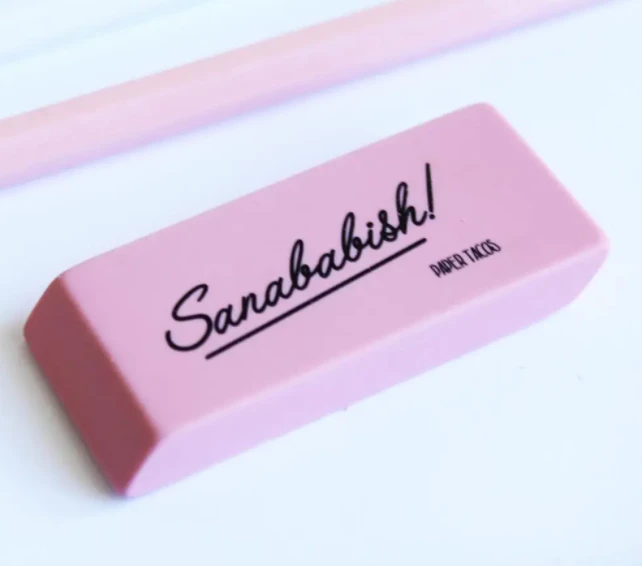 For mistakes that make you yell, “SANABABISH!” * Pink with black imprint * Latex free rubber eraser * Dimensions: 1-1/8″ H x 2 1/2″ W x 1/4″ D