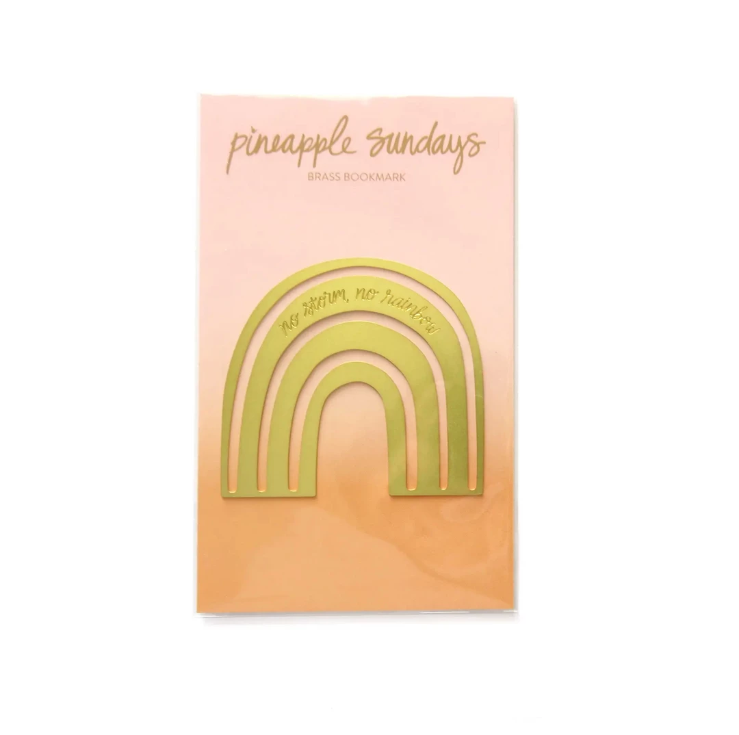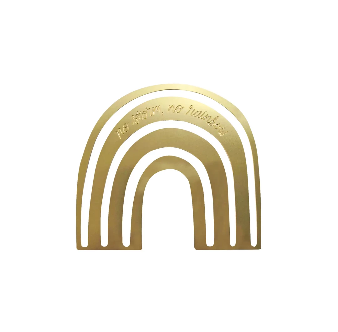 The perfect accessory for books or journals, hand lettering quote “no storm, no rainbow.” Laser-cut & engraved brass.