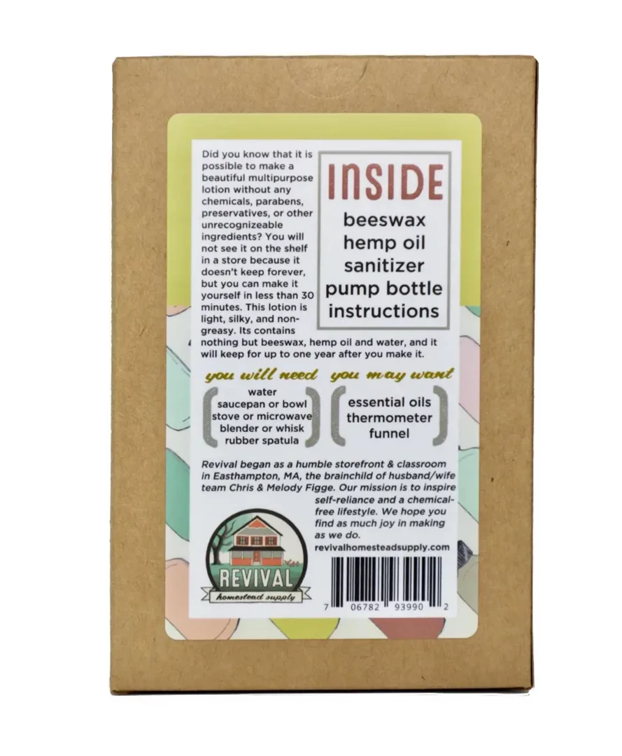 Makes 8 oz of all natural lotion with glass pump bottle. 4x4x6″ Inside: 8 oz. glass bottle with pump hemp oil beeswax instructions + access to our online resources