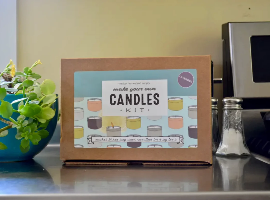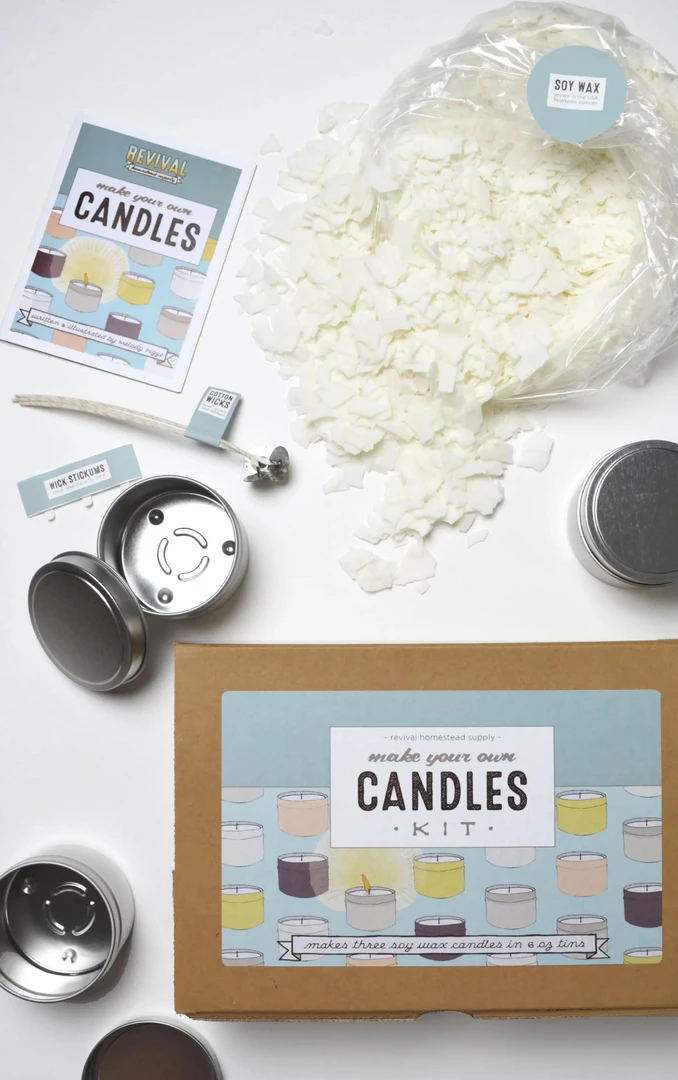 Makes 3 soy candles in 6 oz tins. Unscented/add your own essential oils. 9x7x3” Inside: soy wax 3 tins 3 cotton wicks 3 wick stickers instructions + access to our online resources