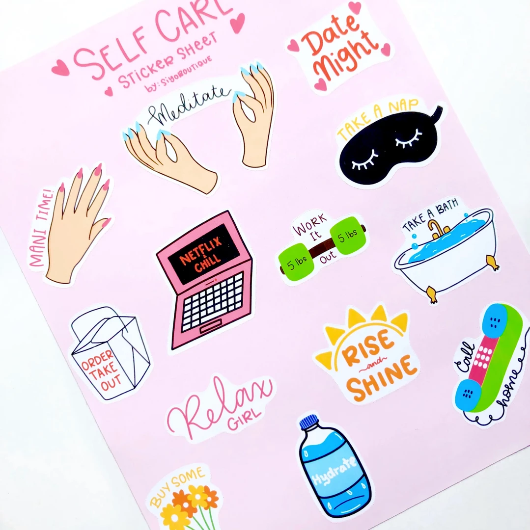 This self care sticker sheet are the perfect addition to a planner! • Includes one (1) sticker sheet • Sticker measures approx. 4.5″ x 6″ inches • Printed on durable, matte, weatherproof, easy to peel and apply sticker paper. *NOT WATERPROOF*. • Keep in mind, colors on screen may vary. • Minor differences may occur between each item. • 12 sticker designs, peel off easily. • Made in Maryland – all designs are done by Tyler Jones, printed, cut and packaged in-house.