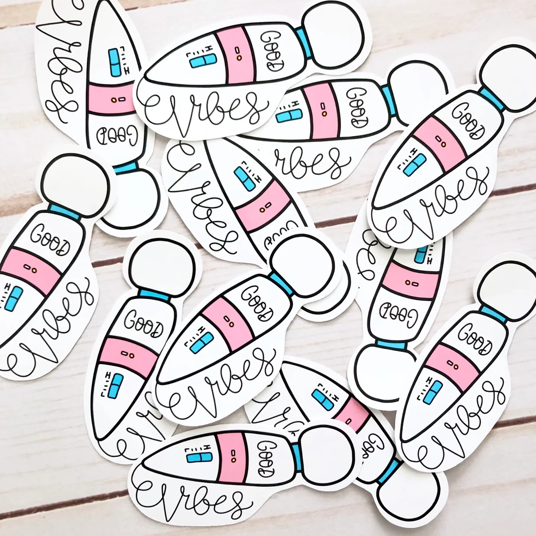 Good Vibes. This sticker is to spread all of the good vibes, in more ways than one. This vibrator sticker is the perfect addition to a laptop, notebook, or wherever you want to spread some good vibes. • Sticker measures approx. 2.5″ x 2.25″ inches • Printed on durable, matte, weatherproof, easy to peel and apply sticker paper. *NOT WATERPROOF*.