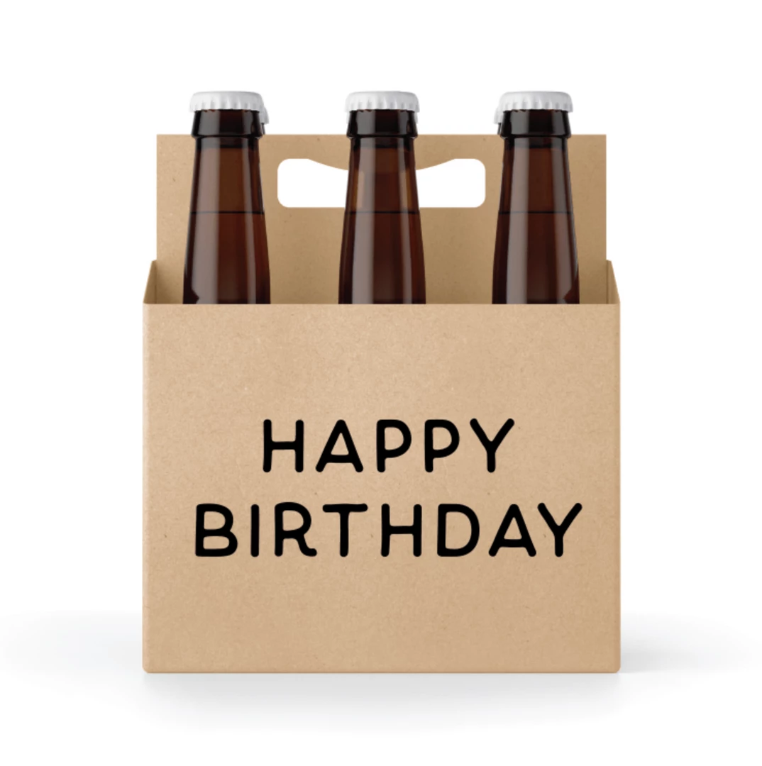 Forget the birthday card and give beer instead! Simply fill the 6 pack beer holder with a mix of your favorite brews and simple as that- card, gift, beer- all in one! โ QUANTITY โ One 6 pack holder โ SIZE โ One Size โ MATERIAL โ Kraft cardboard โ COLOR โ Kraft with black letters โ EXPLORE โ Complete the look and add a 6 pack of Bottle Candles!