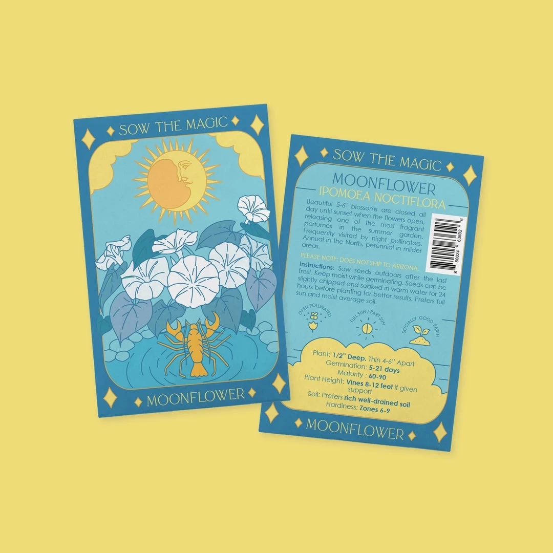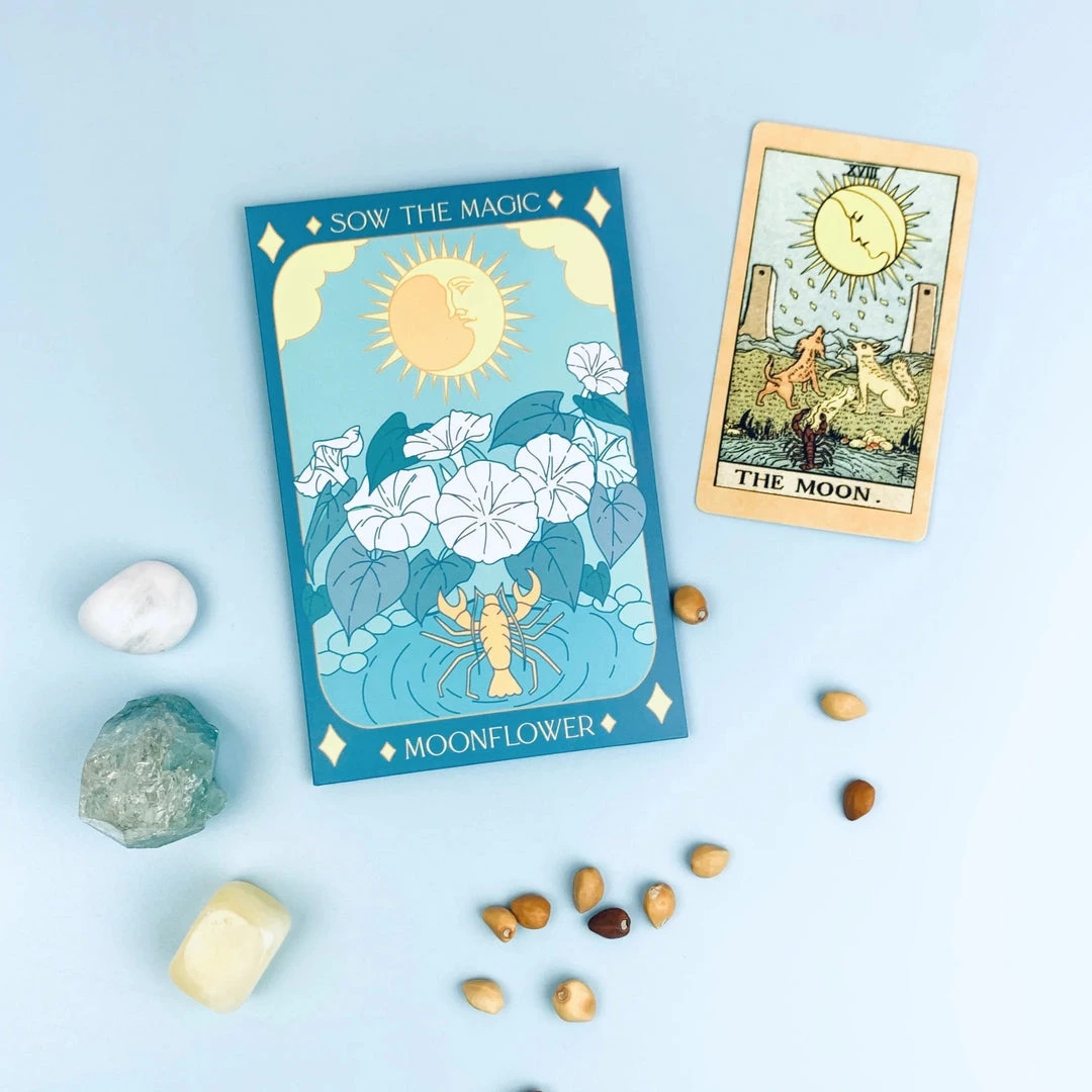 Dance under the light of the moon in your garden, with this romantic Moon Flower that blooms at night. Combined with the Moon card these two will put you in an imaginative state of mind.