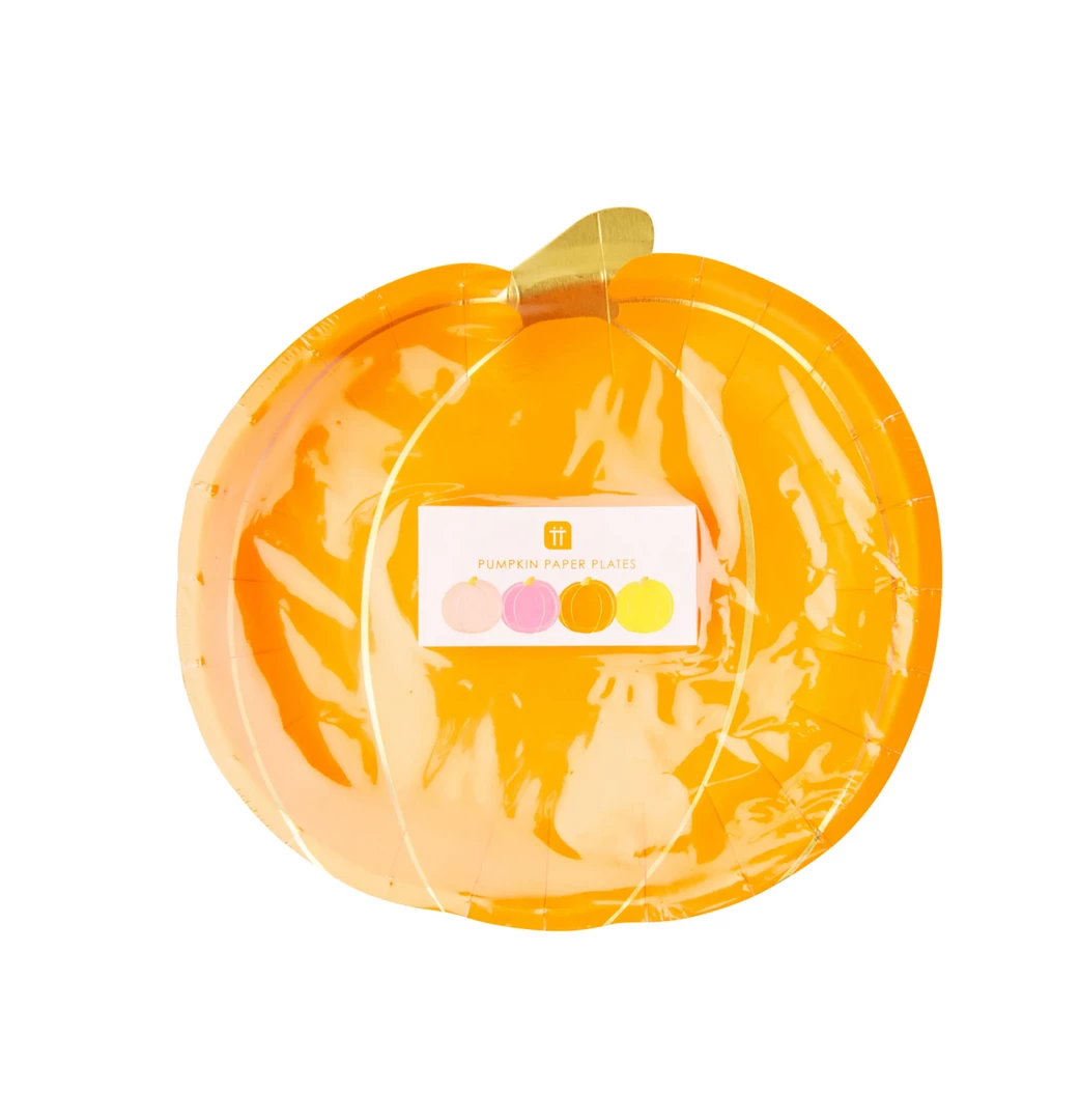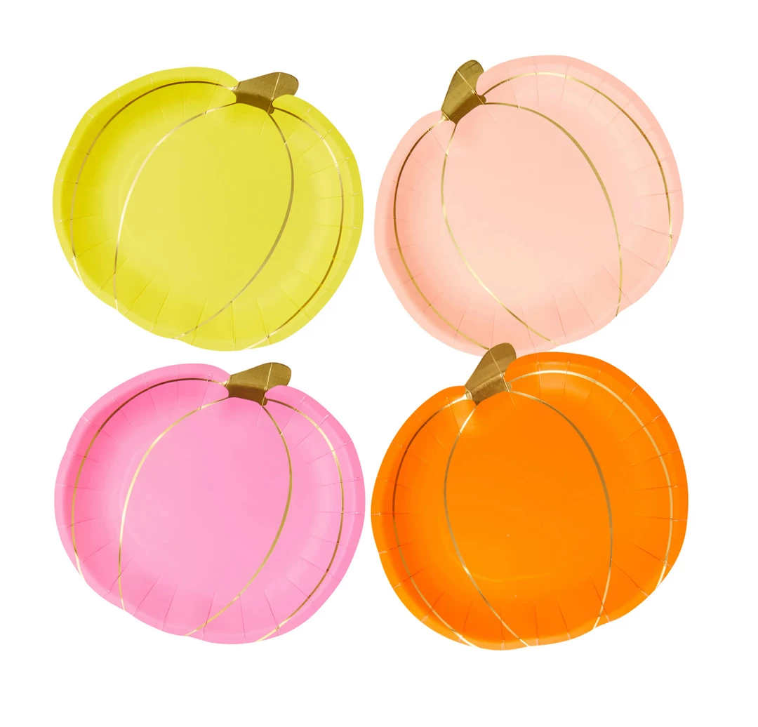 Pack of 8 Colorful Pumpkin Plates by Talking Tables. These pumpkin shaped plates come with 4 different autumnal shades of pink, orange and yellow plates with gold foil detail. The perfect addition to your party tableware for a Halloween Party, Thanksgiving meal or Autumn dinners. Pair with our pumpkin themed tableware and decorations to complete the look. Each pack contains 8 paper plates