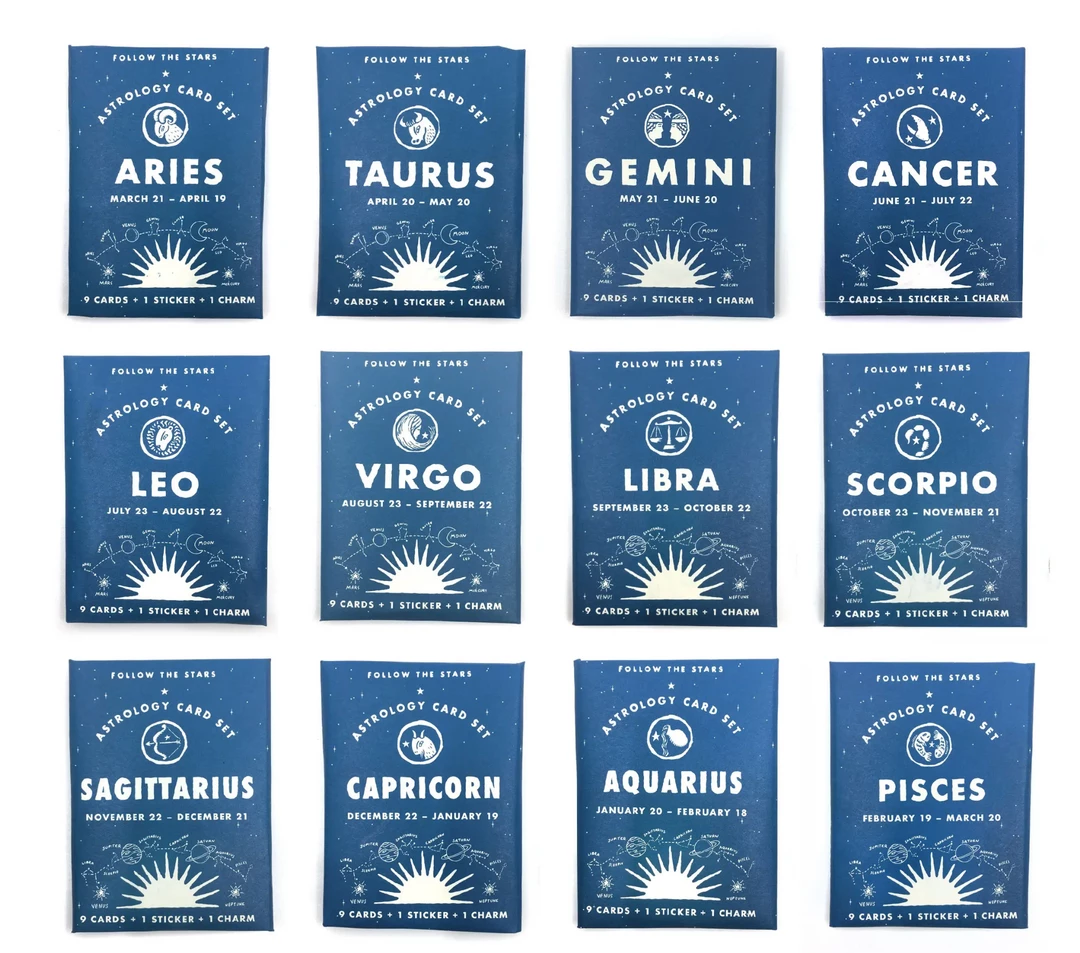 Follow The Stars! Inspired by vintage collectible trading card sets, our Follow The Stars Astrological Card series explores the secrets encoded in the starry night skies above. Each card pack provides an insightful little glimpse into each star sign and explores our connection to the stars above and to one another.