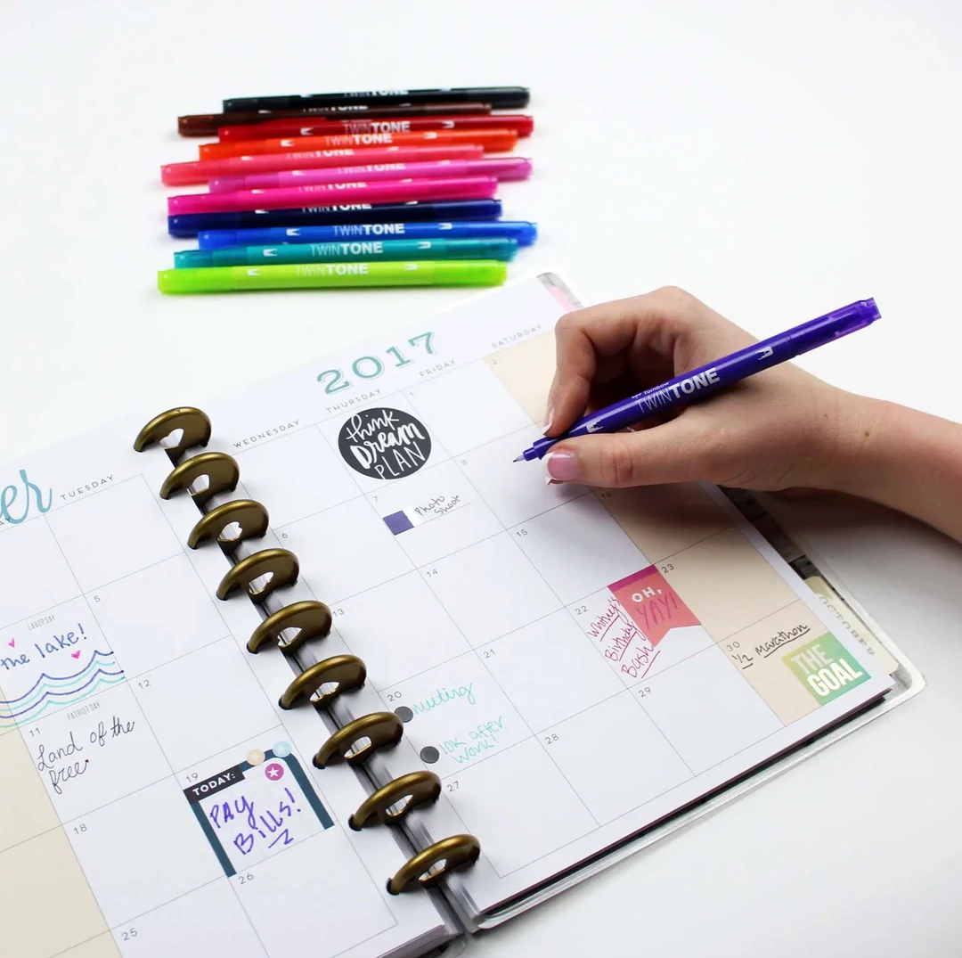 Double-sided marker creates thick or thin lines with two tip choices – broad bullet tip for bold lines or extra-fine tip for detailed, precise lines. Perfect for color-coding and decorating planners, journals, and notebooks. Create fun doodling and lettering styles with a choice of 36 colors. Water-based ink doesn’t bleed through most papers. Durable fiber point tips are long-lasting and maintain shape after use. Bullet tip 0.8mm; extra-fine tip 0.3mm. Colors Included: 50 Lime Green, 85 Emerald Green, 15 Blue, 42 Navy, 82 Grape, 22 Pink, 79 Candy Pink, 77 Cherry Pink, 76 Carrot Orange, 75 Strawberry Red, 41 Chocolate, 33 Black.