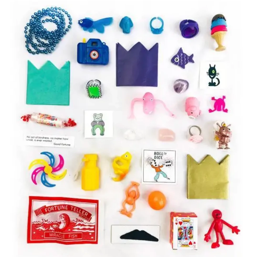 Unwind layers of colorful crepe paper ribbons to reveal precious vintage-inspired keepsakes tucked carefully within this beautifully handmade surprise ball. A memorable for kids and adults. Contains 6 prizes. Surprises inside vary by style & may include: vintage-inspired toy, keepsake, charm, gem, sweets, confetti popper, fortune, temporary tattoo, quote & more. Handmade by artisans in the USA. Warning: Children over 3 years only, small parts.