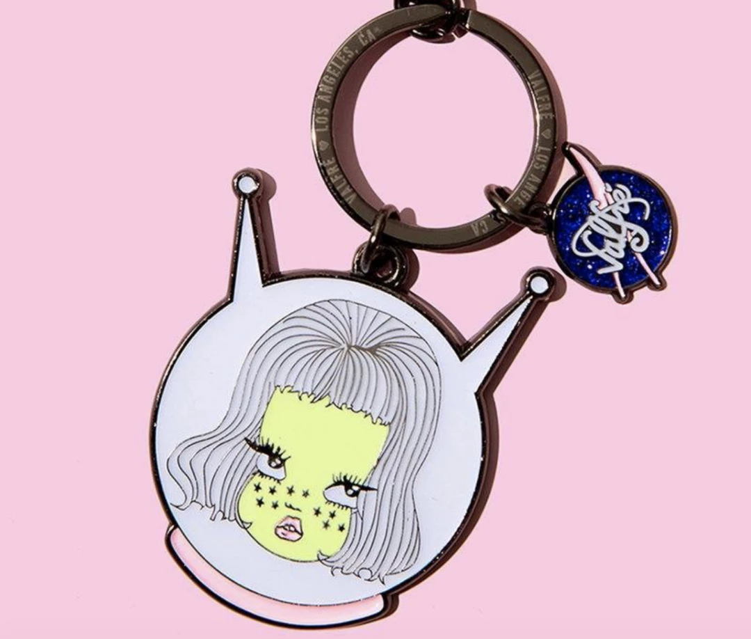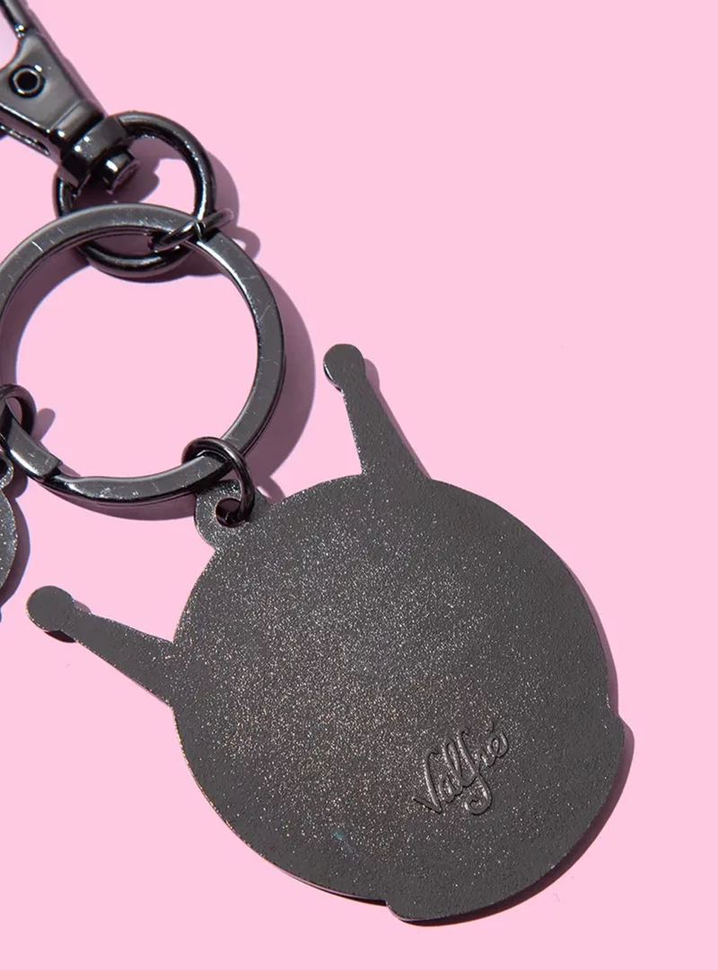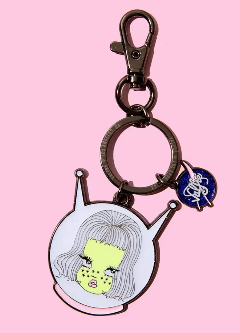 This Space Babe shaped charm features metal edging, enamel filling, glow in the dark green face, a Valfré NASA inspired glitter charm, chain link + key ring. Size – Width: 1.5″ – Height: 1.75″