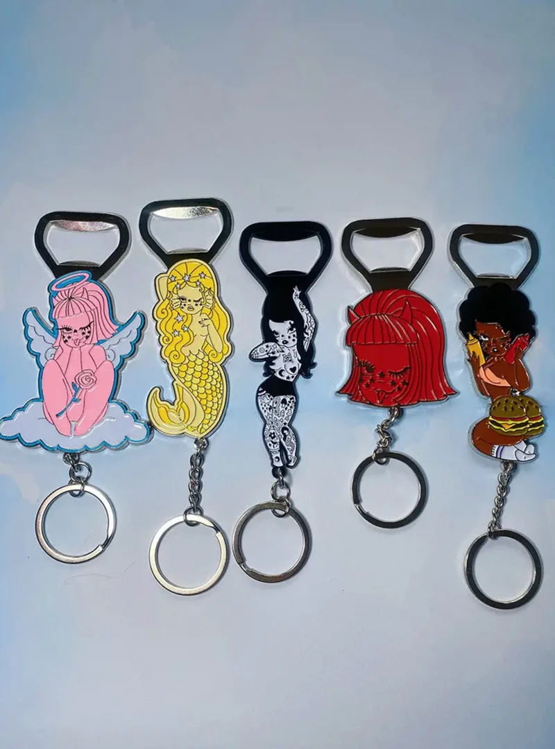 This charm keychain features metal edging and colorful enamel filling complete with a bottle opener, chain link, and key ring. Size – Width: 1.5″ – Height: 3.5″