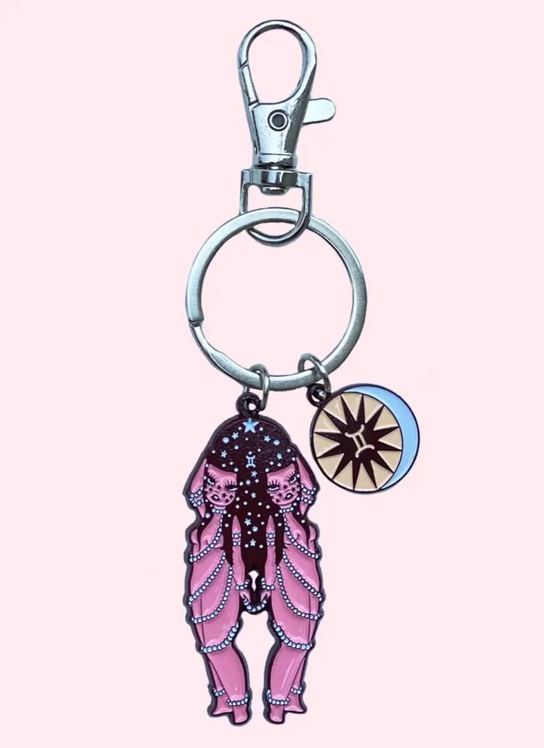 This Gemini charm features metal edging and enamel filling complete with a chain link + key ring.