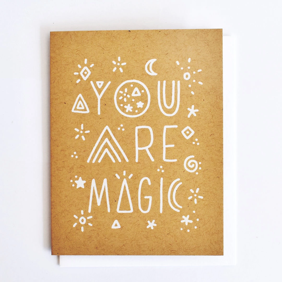 Make someone feel magical today. A card for a special person featuring hand-drawn illustrations and lettering. Silk Screen Printed with water-based ink on professional equipment. Paper: 100# recycled kraft paper. Inks: White. Size: Folded A2. Single Card with one white envelope.